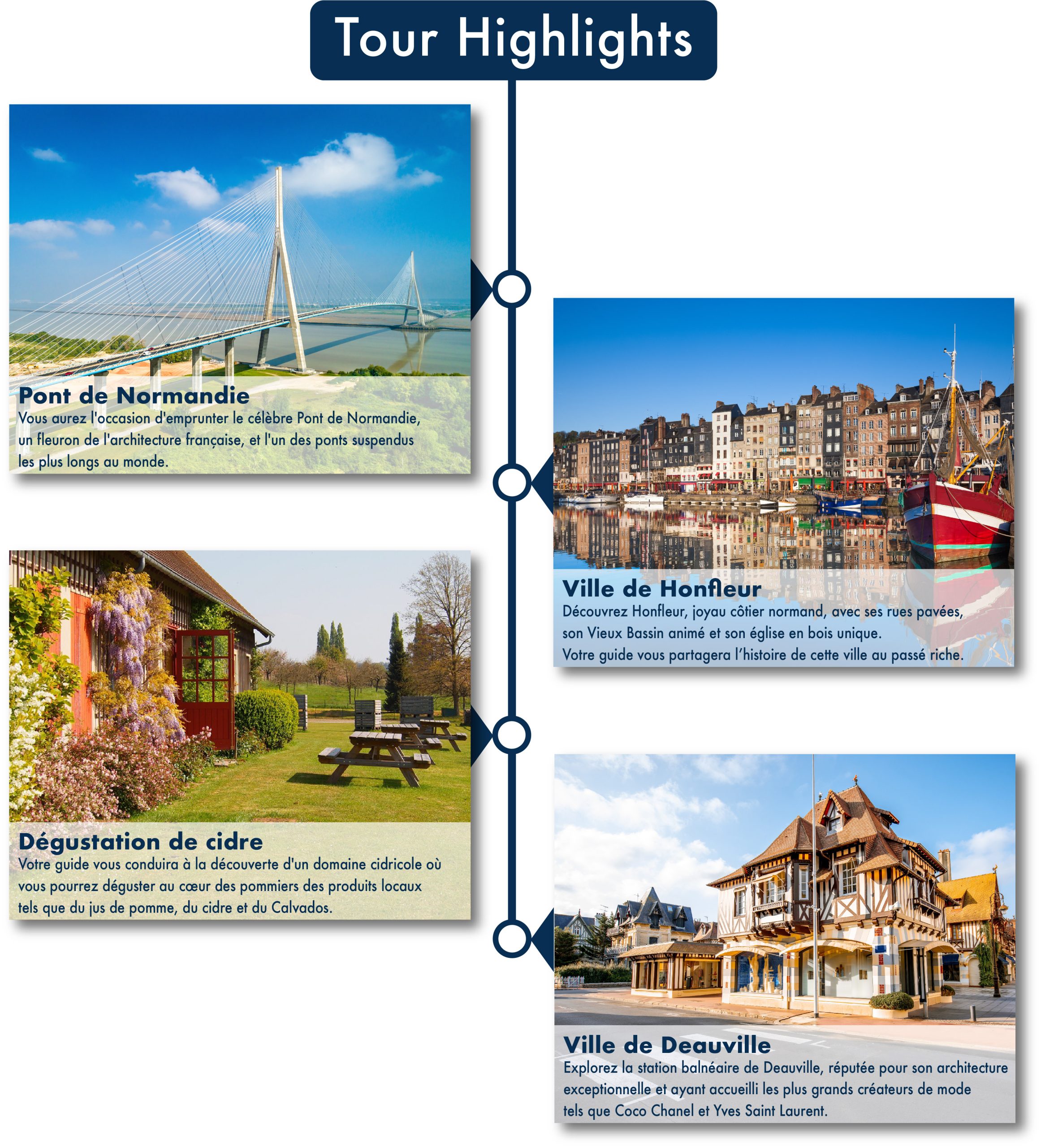 Au départ du port de croisière du Havre ou de Honfleur, offrez-vous une expérience inoubliable avec notre excursion le long de la côte fleurie. De la période viking aux producteurs de cidre, immergez-vous dans l'histoire et la culture locale.